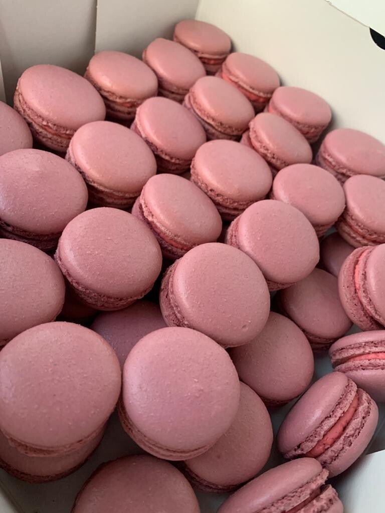 6 macarons in the flavors whyte chocolate, lemon and coconut or pandan