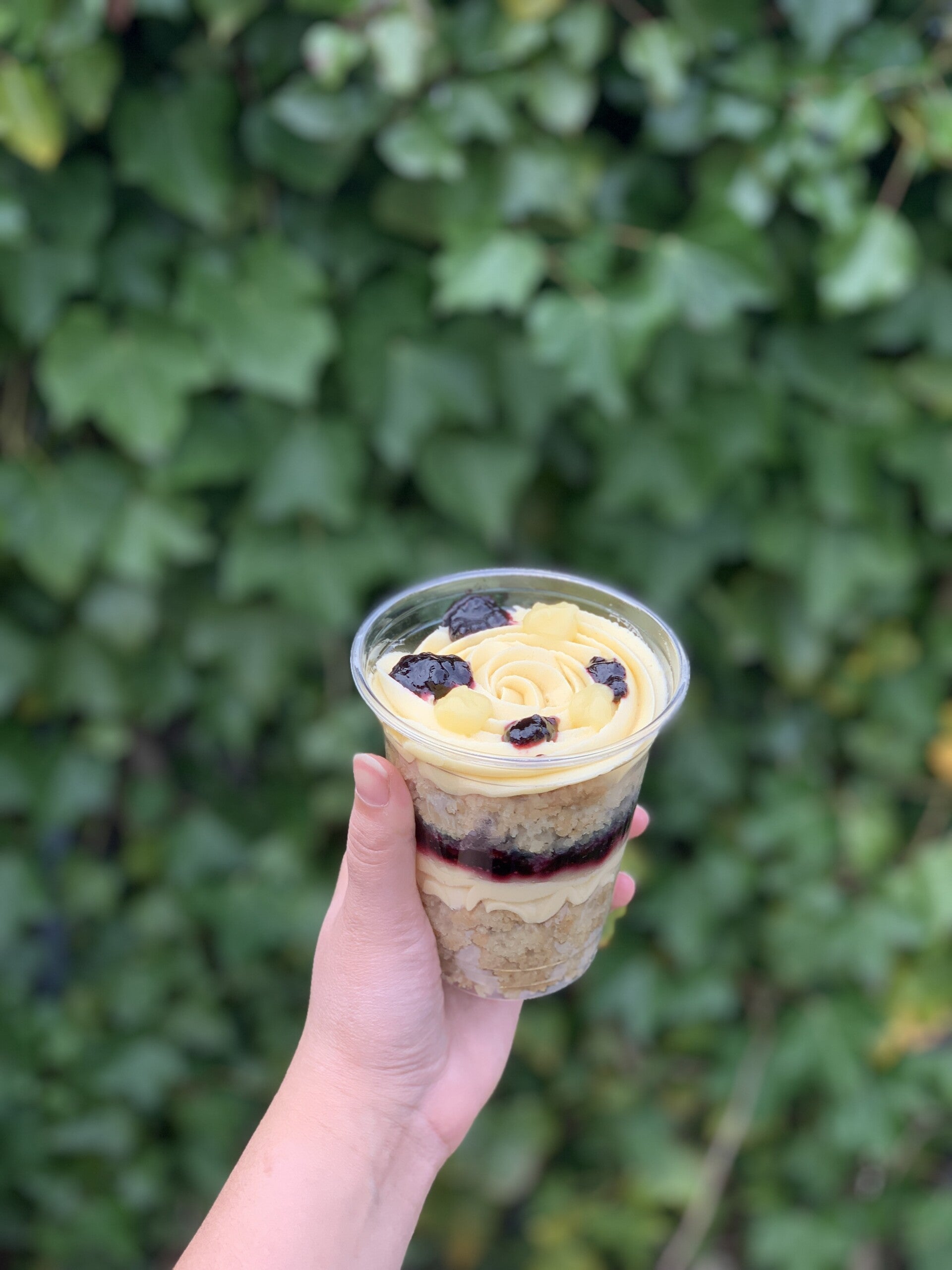 vanilla cake with blueberry compote, lemon curd and vanilla frosting