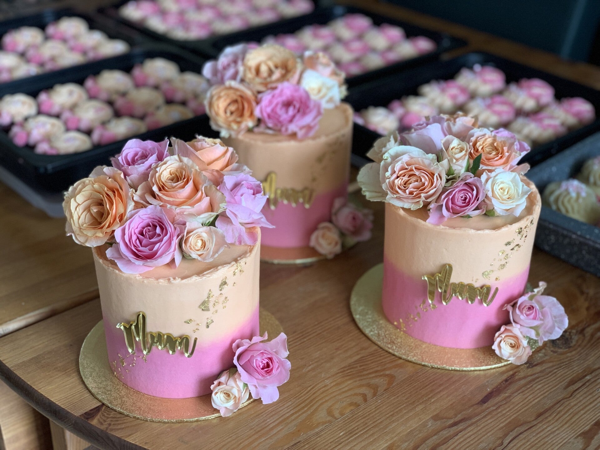 This years designs will be in warm pastel tones and gold, with some (dried) flowers. Including a 'Mum' topper, macarons and other decorations.